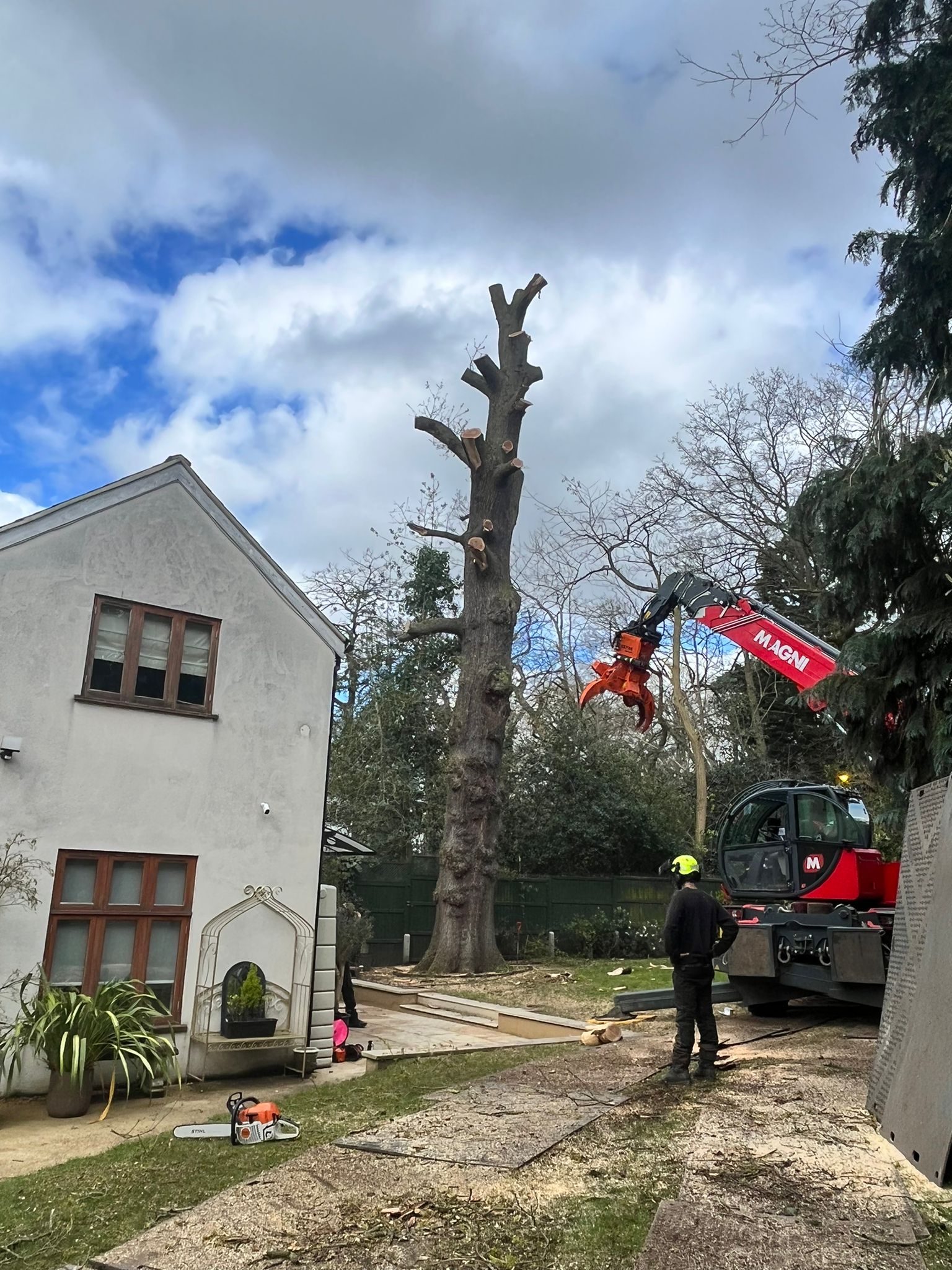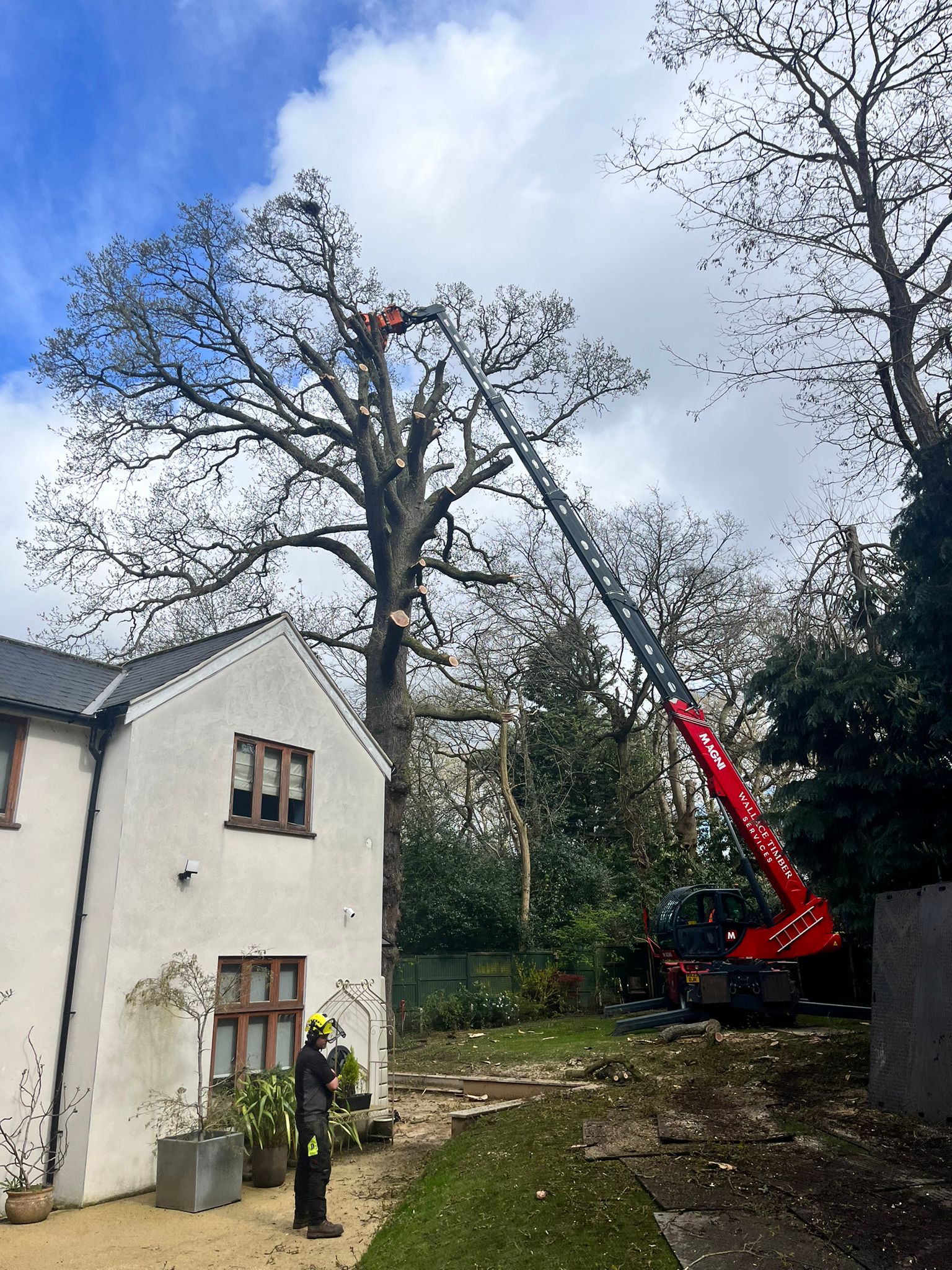 In Weybridge, Parish Tree Surgery recently completed the removal of a large oak tree encroaching on a home’s foundation. While mature trees can add immense character to a property, this particular oak’s roots had begun to compromise the structural stability of the nearby house. Working with Al Wallace Timber Services, we undertook the complex task of removing this tree safely, efficiently, and with minimal disruption, using our expertise and advanced equipment, including the powerful magni roto telehandler with a westech woodcracker grapple saw.
